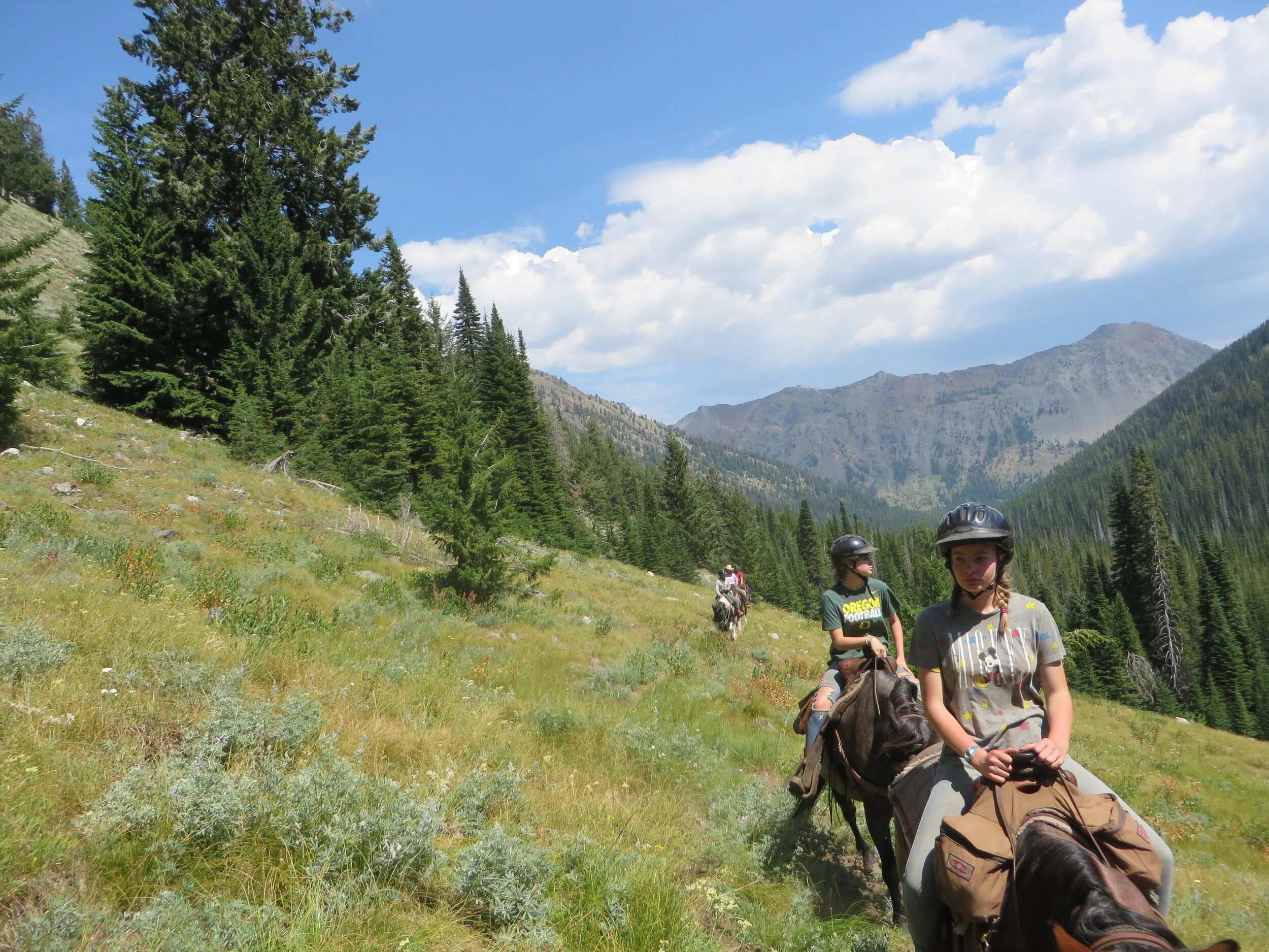 Greenhorn: 3 day / 2 nights at base camp For those looking to “dip their toes” in a wilderness experience, or someone who has only a short time frame… this pack trip hits all the high points! Each day will be spent riding and will be filled with awe-inspiring views, lots of relaxation and wonderful meals. The deluxe camp allows you to sleep on cots (either in dome or wall tents), use camp chairs, have a cook tent for eating in inclement weather and more. $750 per adult Suitable for all riding levels See our gallery for amazing pictures!